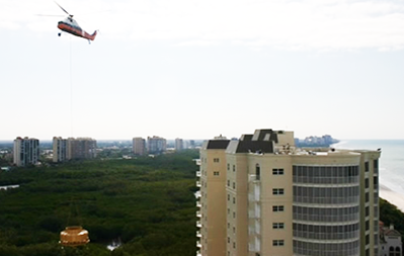 In 2005, Contessa Condos, our service customer challenged us with replacing their 2 cooling towers on the top of their 22 story building. The pathway to the facility had brand new pavers installed and we were not allowed to bring a crane to run on top of the new pavers. Therefore, as shown in this picture, we landed a helicopter on the beach nearby and attached the cooling towers for the helicopter to fly them to the roof
